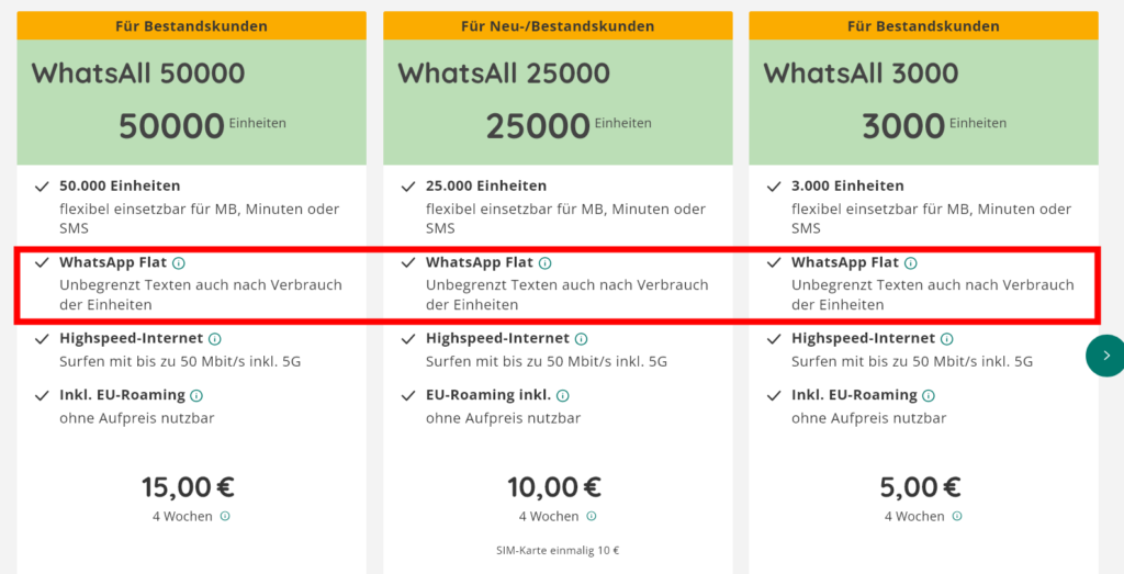 - WhatsAll 50000: Für Vielsurfer gibt es die größte Option für 15 € pro 4 Wochen mit 50.000 Einheiten (bis zu 50 GB).
