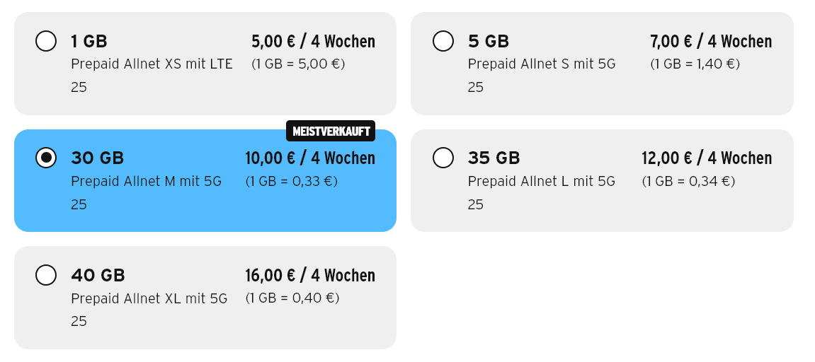 - CallYa Allnet Flat M: 30 GB für 14,99 € pro 4 Wochen, ebenfalls mit Allnet-Flat und 200 Minuten/SMS ins EU-Ausland.